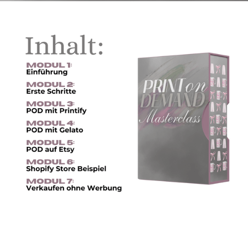 Mit Print on Demand Masterclass lernst du, wie du deine Designs, Ideen oder Sprüche auf Produkte wie T-Shirts, Tassen oder Poster bringst – und sie weltweit verkaufst, ohne dich um Lagerung oder Versand zu kümmern.